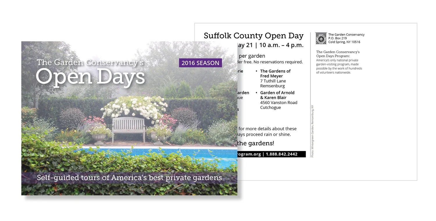 To further promote the garden-visiting season and market the Open Days Directory, I designed direct mail pieces, emails and ads, and administered webpages.